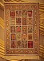 A handwoven silk wall hanging carpet with a grid of twenty intricately embroidered square panels adorned with shimmering Swarovski crystals, radiant rhinestones, & lavish embellishments. This intricate piece showcases exquisite design details, enriched with luminous jewels & elegant pearls