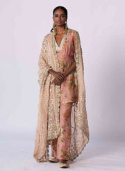 Peach Strappy Kurta & Beige Tulle Metallic Jacket with Feathers