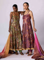 A form fitted Purple Sleeveless Kurta fabricated from Multi-coloured Floral print Silk. Featuring beaded gold straps and gold tassel trimmings. Paired with a shaded silk dupatta and matching churidar to complete the look.