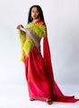Featuring an abstract saree design that exudes elegance with its flowing silhouette fabricated from lavish Red Silk. Add a pop of color to your ensemble with the Lime Green Ostrich Feather Tulle Shawl.