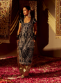 Kurta: Black velvet long kurta with cap sleeves, side tie-ups, and heavy embellishments.