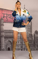 A hand-painted cropped taffeta jacket with a white to blue gradient colour & denim underlinning. Capturing the magic of Mumbai city with embroidered appliqué motifs.