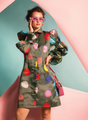 Olive green tafetta silk polka dotted dress with bubble exaggerated sleeves