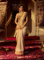 Saree: Cream and gold Chanderi saree featuring a gold Banarasi border, accented with floral zardozi and mirror work patti.