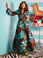 A free-flowing long length dress with a front-open slit, crafted from a beautiful French organza fabric. It features a brown & turquoise print with an exaggerated hemline and sleeves.