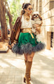 A dual tone balloon dress in shades of cream and emerald green. The halter design with exaggerated grey feathers at the bottom makes it the perfect modish pick this festive season.