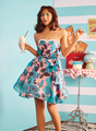 A classic short flowing dress crafted from a vibrant printed French organza fabric. The dress is completed with a tie-up bow on the waist.