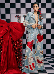METALLIC THREAD SHIRT PAIRED WITH BLUE FLARE SWAROVSKI HEART JEANS