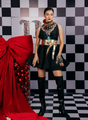 DRESS: A black taffeta sleeveless flared dress with a low back and tie-up bow, paired with a richly embellished Swarovski and wood-bejeweled neckline featuring opaque stones and a statement cross brooch.