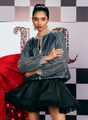 JACKET: A grey leather zip-front bomber jacket featuring dramatic Swarovski mesh exaggerated sleeves and functional zipper pockets for high-glam impact.