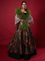 Why MM Loves It: A glamourous black strappy blouse embellished with black beads & tassels. Paired double-layered lehenga that carries an abstract circular design in black & orange. Weaved to perfection on rich fabric like Jacquard & Taffeta to add volumes of drama and timeless allure. Completed with a rose pink psychedelic rhinestone shawl curated with Swarovski stones & exaggerated with olive green ostrich feathers.