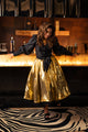 A high-waisted blue & gold metallic wrap around skirt, exaggerated with a tie up bow. Completed with a black underlining.