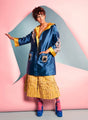 A dual-toned oversized long zipper jacket crafted with blue silk, has a yellow uderlining and the pockets have distinct rose applique embroidery.